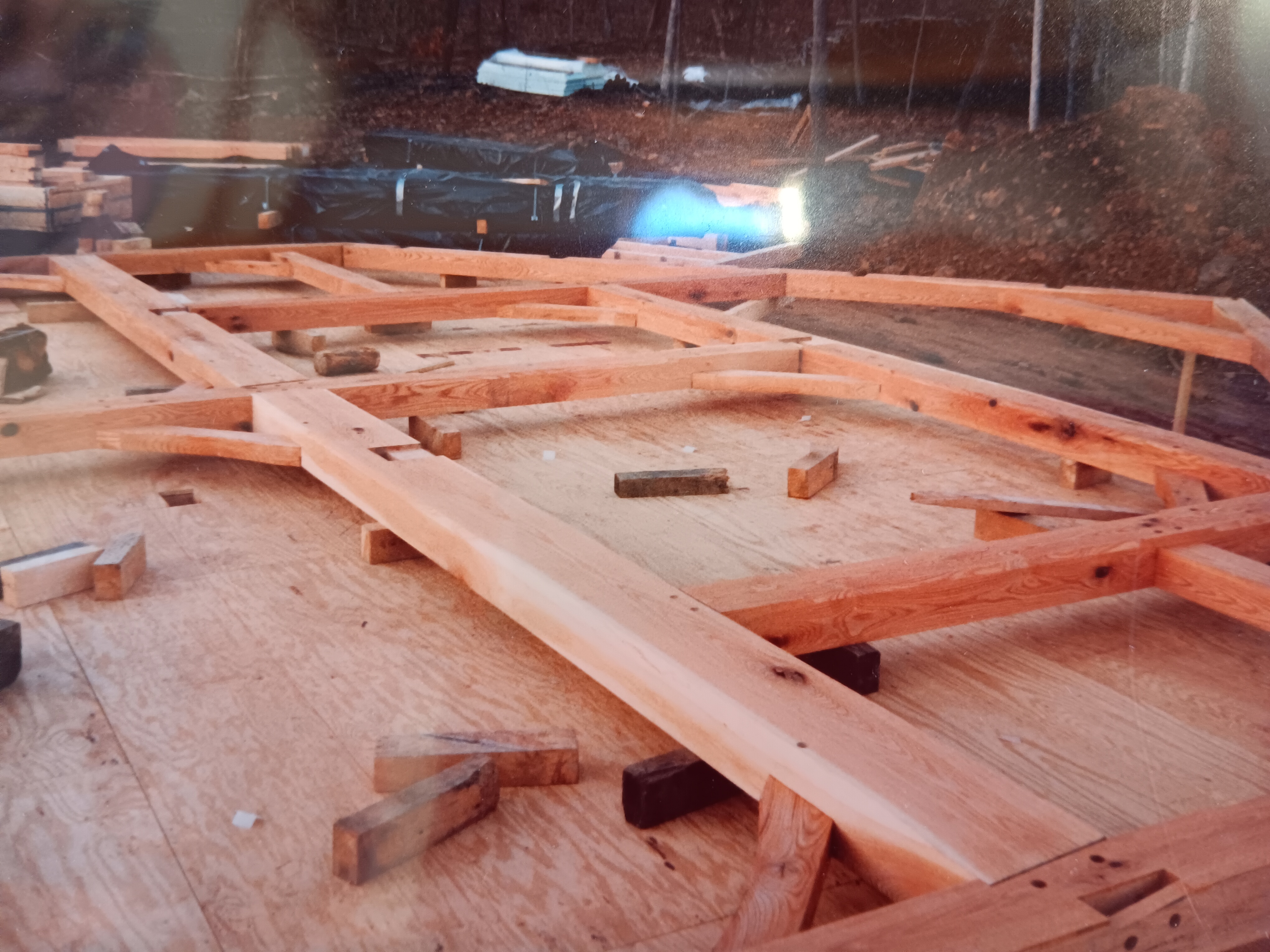 Stew hired a company (I forget the name, but it might have been Benson) to do the post and beam part of the construction. They made the 4x6, 5x6, and 6x6 oak beams, including corner bracing, at their shop. Their